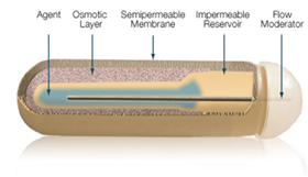 ALZET® Osmotic Pumps 是體積只有膠囊大小的滲透壓泵,符合 USP 醫(yī)療塑料膠材料生物相容性標(biāo)準(zhǔn),可植入實驗動物皮下或腹腔內(nèi),直接或通過導(dǎo)管以 ul/小時的速度緩慢持續(xù)準(zhǔn)確地送出測試藥劑。Alzet 緩釋泵由外到內(nèi)分為三層(如下圖所示),最外層是半透膜材料(Semipermeable Membrane),最內(nèi)層為不透水彈性材料制成的貯藥囊(Impermeable Reservoir),中間為高滲的鹽夾層(Osmotic Layer)。當(dāng)泵體被植入動物體內(nèi)時,由于滲透壓差迫使體液透過泵表面的半透膜流向高滲鹽夾層,擠壓貯藥囊,使藥物(Agent)按照預(yù)計速度經(jīng)導(dǎo)流管(Flow Moderator)釋放到動物體內(nèi)。