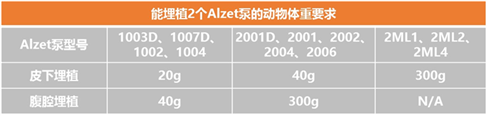 埋植多個Alzet泵必須確保動物體重足夠大,能容納多個泵的大小和重量。下表總結(jié)了埋植2個指定型號給藥泵時動物需要滿足的最小體重。