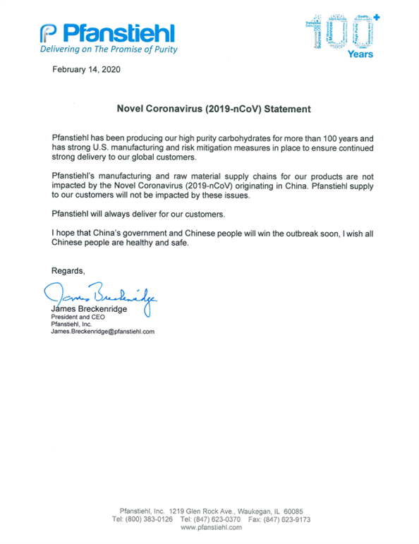 新型冠狀病毒肺炎 (COVID-19) 疫情已發(fā)展為影響全球的公共衛(wèi)生事件,隨著我國開啟全面的復(fù)工復(fù)產(chǎn),我們的供應(yīng)商Pfanstiehl承諾將一直保持產(chǎn)出并保障供應(yīng)全球客戶。
