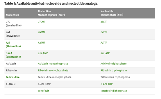 抗病毒核苷/核苷酸類似物可以通過抑制病毒復(fù)制的幾個關(guān)鍵過程來抑制病毒繁殖,它們通過與天然的dNTP/NTP競爭結(jié)合到新的病毒核酸中,從而導(dǎo)致鏈終止或者誘變。在細(xì)胞培養(yǎng)實驗中,可以用抗病毒核苷酸的非磷酸化核苷變體,這種核苷酸在細(xì)胞內(nèi)被多種病毒和/或宿主激酶激活,從而發(fā)揮(tri)磷酸化形式的抗病毒作用。