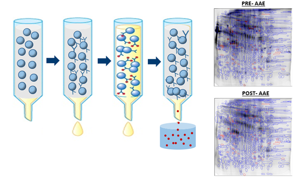 2014年,作為過(guò)程污染物殘留檢測(cè)產(chǎn)品領(lǐng)先開發(fā)商,Cygnus結(jié)合多年HCP抗體及試劑盒開發(fā)經(jīng)驗(yàn),推出了Affinity Antibody Extraction(AAE)方法驗(yàn)證覆蓋率,突破了傳統(tǒng)2DWB方法驗(yàn)證覆蓋率的局限性,更真實(shí)準(zhǔn)確反應(yīng)HCP抗體覆蓋率。AAE提取富集的樣品和未經(jīng)AAE提取的樣品分別經(jīng)過(guò)2D PAGE分離后使用銀染的方法對(duì)得到的點(diǎn)進(jìn)行匹配、計(jì)數(shù)、計(jì)算覆蓋率。這種方法一經(jīng)上市后,廣泛得到生物制藥企業(yè)和監(jiān)控部門的認(rèn)可。
