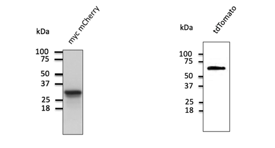 ? ? 西美杰代理SICGEN品牌提供的Anti-mCherry和Anti-tdTomato均為從圓盤珊瑚中提取的紅色熒光蛋白的多克隆抗體。Anti-mCherry和Anti-tdTomato兩種抗體的抗原均是大腸桿菌表達的重組多肽純化而來,用Western blot檢測轉(zhuǎn)染了兩種蛋白的HEK293細胞,分別可檢測到29kda和55kda的條帶。Anti-tdTomato抗體對tdTomato和mCherry均有特異性,但與綠色熒光蛋白(GFP)不發(fā)生交叉反應(yīng)。???????????