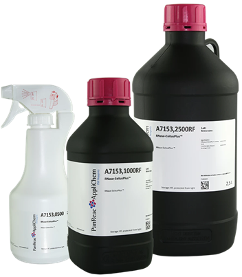 在mRNA疫苗的生產(chǎn)以及其他與mRNA相關(guān)的生物制品中,RNase污染的清除尤為重要,德國Applichem研發(fā)的RNase-ExitusPlus?是一種非堿性、無腐蝕性且無致癌性的新型RNase清除液,它對RNase污染物具有很好的清除性能,是適用于任何表面的即用型RNase污染清除液,可用于實(shí)驗(yàn)室表面的清潔,如實(shí)驗(yàn)操作臺、電泳設(shè)備、移液器和反應(yīng)管等。