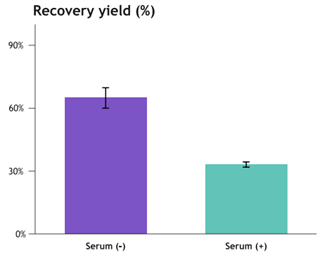 圖4. 有無(wú)血清培養(yǎng)體系慢病毒回收率:純化后樣品中慢病毒/病毒原液%。