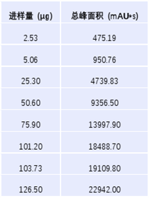 圖3. 舟帆生物ZF-LC-0001流動相線性及進樣量與總峰面積數(shù)據(jù)