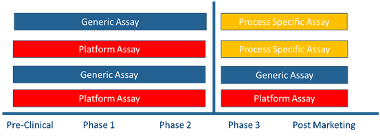 USP<1132>提到在沒有平臺化方法的情況下可以在臨床前、臨床I期、II期使用商品化試劑盒;在臨床III期/工藝驗證及產(chǎn)品上市后,由于商業(yè)化的通用HCP檢測試劑盒抗體的覆蓋率往往不足等局限性,需要考慮結(jié)合細胞類型及工藝特異性等因素,使用平臺化方法或針對上游工藝開發(fā)的產(chǎn)品/工藝專屬性方法。