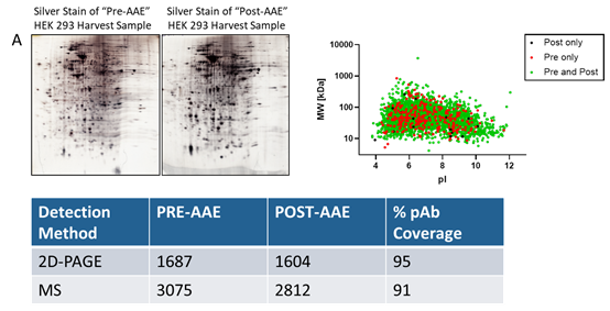 AAE-MS?也可以對藥物原液中HCPs富集的同時去除了大部分原料藥。去除原料藥極大地提高了通過2D-PAGE和質(zhì)譜分析識別單個HCPs的能力,因為藥品通常以104-106的倍數(shù)掩蓋HCPs。AAE-MS?是一種更客觀和直接的方法檢測和鑒定原料藥中任何潛在的HCPs雜質(zhì)以幫助優(yōu)化下游純化工藝。