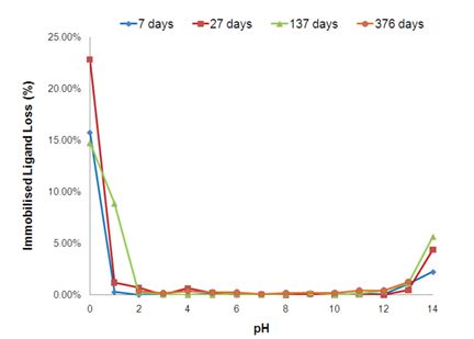 在室溫條件下,在從pH 0.0(1 M HCl) 到pH 14.0 (1M NaOH) 的一系列測試溶液中孵育的APB A6XL的pH穩(wěn)定性曲線。收集上清液樣品并以連續(xù)暴露1周至1年的特定時(shí)間間隔測定配基的脫落情況。