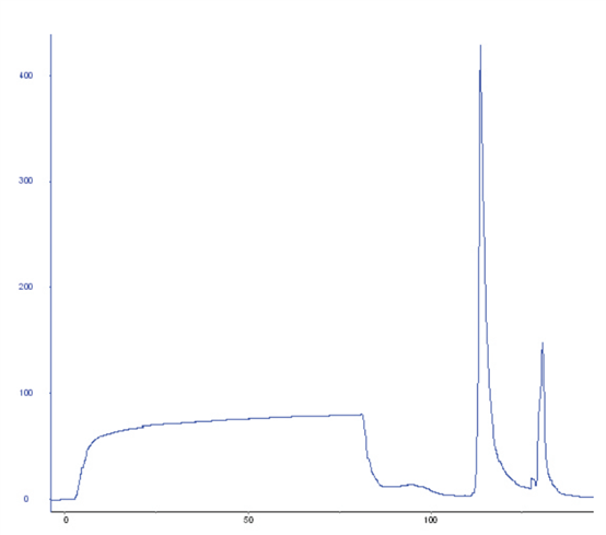 APB層析填料特別適用于糖蛋白的捕獲和純化。下圖展示了一個(gè)經(jīng)典的親和純化色譜圖,其中有一個(gè)大的流穿和一個(gè)小的離散洗脫峰。在50 mM山梨醇洗脫后達(dá)到完全的目標(biāo)糖蛋白回收。