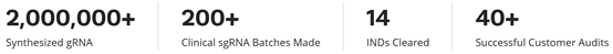 Synthego提供的GMP級gRNA與核酸酶產(chǎn)品嚴(yán)格遵循GMP標(biāo)準(zhǔn)進(jìn)行開發(fā),專為滿足IND申報(bào)以及臨床應(yīng)用所要求的高精度標(biāo)準(zhǔn)而設(shè)計(jì)??蛻艨梢劳?/span>Synthego先進(jìn)的生產(chǎn)平臺,確保其研發(fā)流程符合全球最嚴(yán)格的監(jiān)管規(guī)范。截至目前,Synthego已成功支持超過12項(xiàng)CRISPR基因編輯療法的IND申報(bào),在行業(yè)內(nèi)建立了高度可信的品牌聲譽(yù)。其持續(xù)穩(wěn)定的GMP級產(chǎn)品供應(yīng)能力,充分體現(xiàn)了Synthego致力于推動以臨床療效為導(dǎo)向的基因編輯技術(shù)革新的長期承諾。