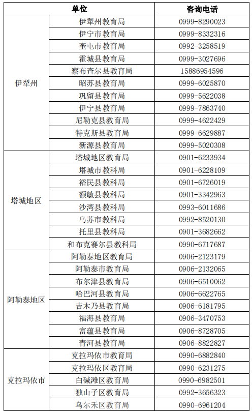 新疆各地教師資格認(rèn)定機(jī)構(gòu)咨詢電話: