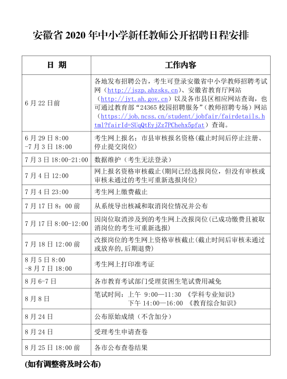 安徽省2020年中小學(xué)新任教師公開(kāi)招聘日程安排和筆試大綱已確定,現(xiàn)予發(fā)布。