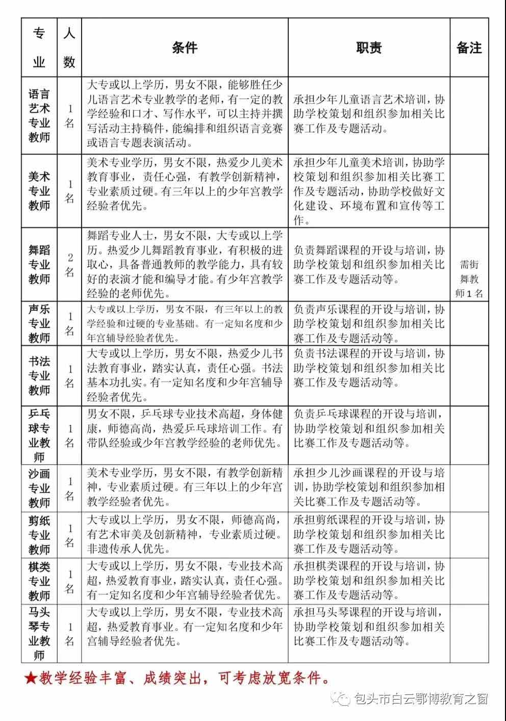 白云鄂博礦區(qū)中小學(xué)綜合實踐學(xué)校是白云鄂博礦區(qū)唯一一所集中小學(xué)課后藝體特長培養(yǎng)、綜合實踐教育、初高中通用技術(shù)教學(xué)、研學(xué)旅行于一體的綜合性實踐學(xué)校。學(xué)校目前共開設(shè)8個藝體特長培訓(xùn)班,服務(wù)全區(qū)近1000余名中小學(xué)生。在國家“雙減”政策背景下,為切實減輕家長負(fù)擔(dān),打造服務(wù)于白云區(qū)中小學(xué)生的公益普惠性課后服務(wù)體系,區(qū)中小學(xué)綜合實踐學(xué)校藝體培訓(xùn)項目及班額需進(jìn)行進(jìn)一步擴(kuò)充,需向社會公開招聘部分藝體特長專業(yè)教師,現(xiàn)將招聘方案公布如下: