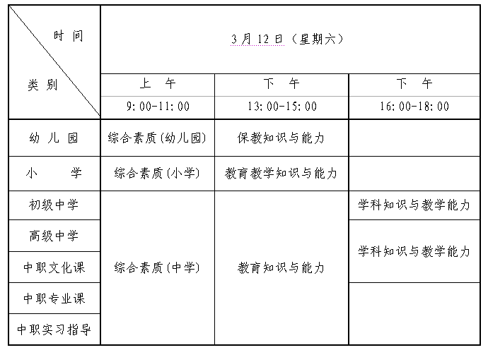 (一)全國中小學(xué)教師資格考試(筆試)日期為2022年3月12日,具體時間安排如下: