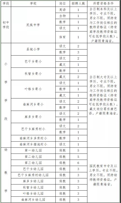 6.年齡在35歲以下(1986年1月1日以后出生),在曲麻萊縣各中小學(幼兒園)代課6年以上的年齡可放寬至40周歲以下(1982年1月1日以后出生);