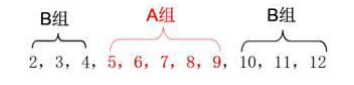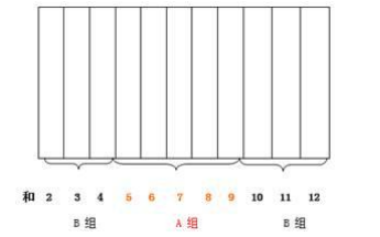 教師:雖然擲出的兩個骰子的點數(shù)之和可能是 2,3,4,…,12 中的任意一個數(shù),但這些和出現(xiàn)的可能性大小是不同的。下面老師把可能出現(xiàn)的這 11 個和分成 A、B 兩組,如下圖所示: