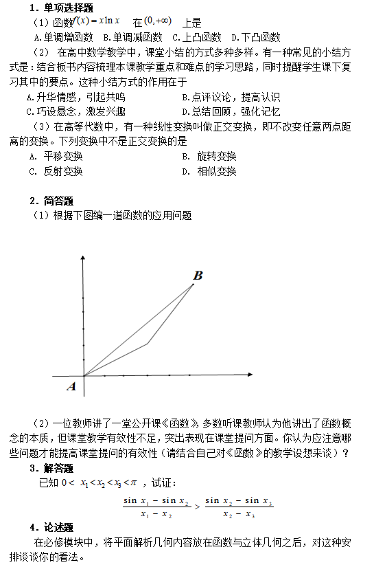 1.?dāng)?shù)學(xué)學(xué)科知識的掌握和運(yùn)用。掌握大學(xué)本科數(shù)學(xué)專業(yè)基礎(chǔ)課程的知識和高中數(shù)學(xué)知識。具有在高中數(shù)學(xué)教學(xué)實踐中綜合而有效地運(yùn)用這些知識的能力。