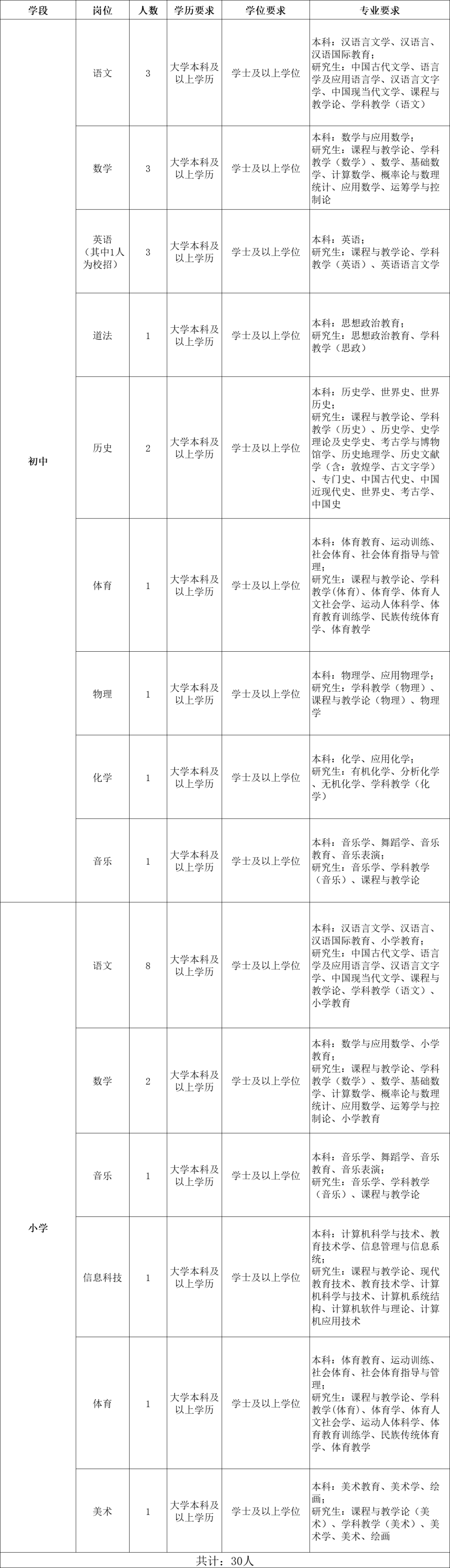 學(xué)校因發(fā)展需要,現(xiàn)面向社會公開招聘教師30名,其中初中教師16人,小學(xué)教師14人,具體要求如下。