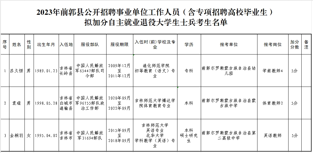 附件:2023年前郭縣公開招聘事業(yè)單位工作人員(含專項(xiàng)招聘高校畢業(yè)生)擬加分自主就業(yè)退役大學(xué)生士兵考生名單 |