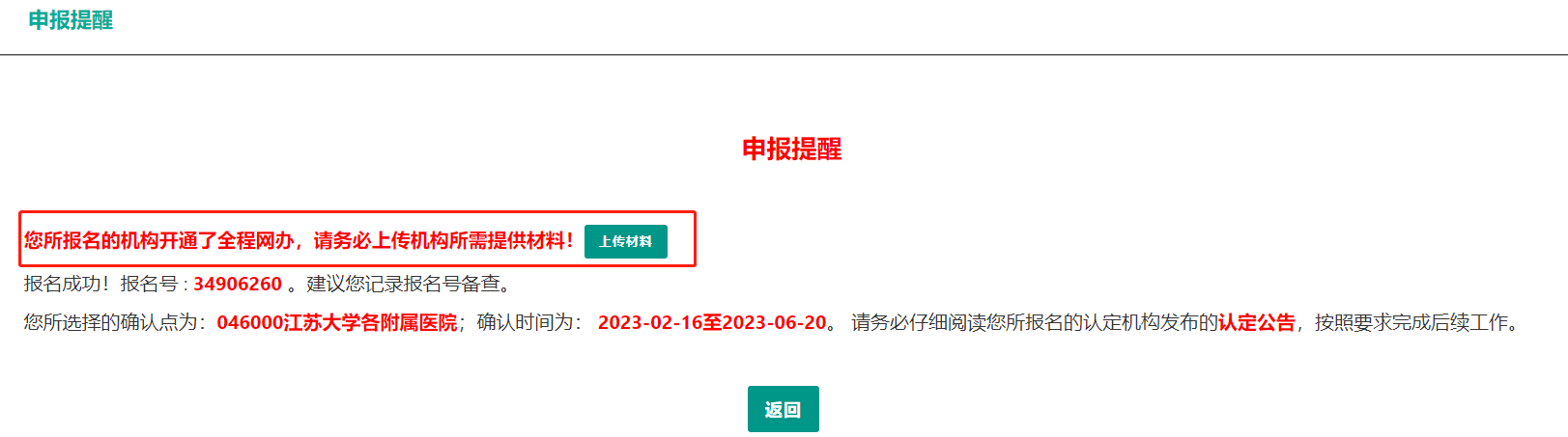 出現(xiàn)【上傳材料】按鈕,說明您選擇的認(rèn)定機構(gòu)開通了全程網(wǎng)辦,需要按照認(rèn)定機構(gòu)的工作要求上傳全程網(wǎng)辦相關(guān)材料。如對所需材料有疑問,可咨詢認(rèn)定機構(gòu)。