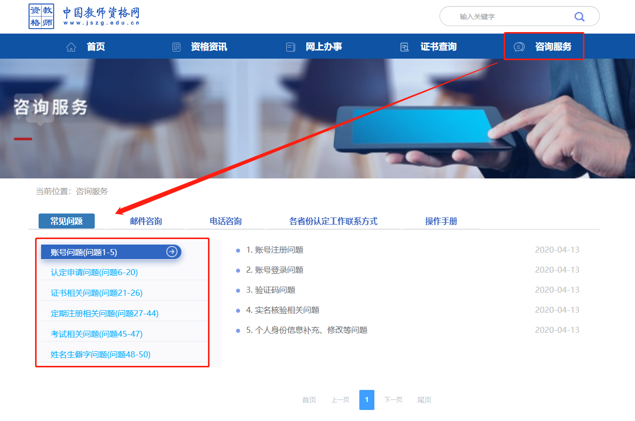 在教師資格認(rèn)定過程中遇到問題,請先參考中國教師資格網(wǎng)導(dǎo)航欄中的咨詢服務(wù)—常見問題對照處理。