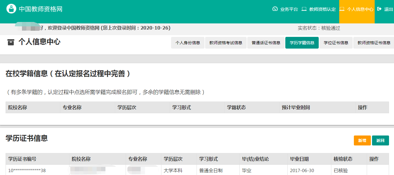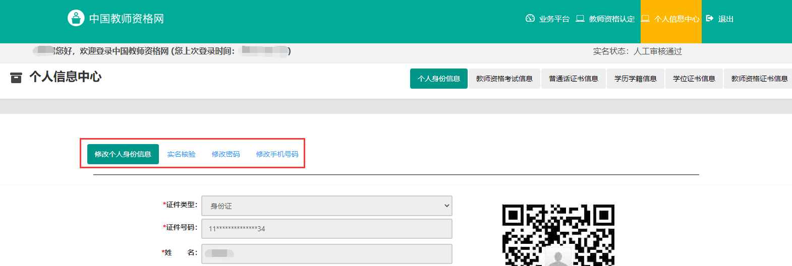 個人信息中心共有七個模塊:個人身份信息、教師資格考試信息、普通話證書信息、學(xué)歷學(xué)籍信息、學(xué)位證書信息、教師資格證書信息、其他證書信息。