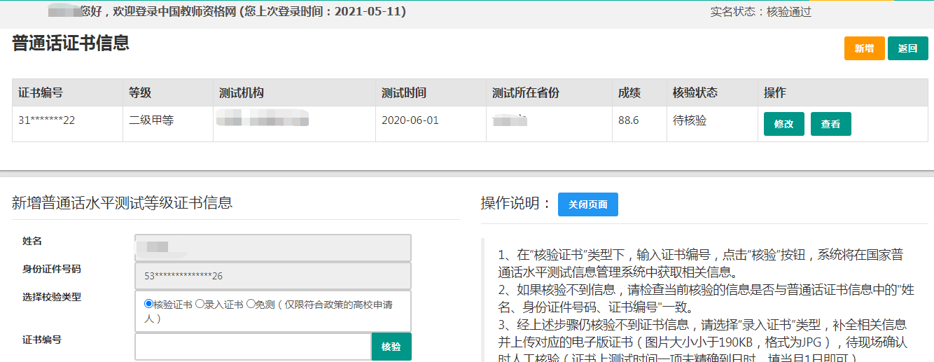 ②錄入證書:僅限2007年之前的普通話證書或無法核驗通過的證書。補全相關(guān)信息(普通話信息分?jǐn)?shù)欄必須填寫數(shù)字)后,需攜帶證書原件至現(xiàn)場確認(rèn)時人工核驗。核驗狀態(tài)指系統(tǒng)核驗狀態(tài),人工核驗通過不會更改核驗狀態(tài)。
