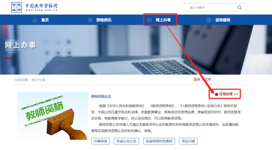 教師資格認(rèn)定申請人進(jìn)入申報系統(tǒng)的入口為【網(wǎng)上辦事】—【教師資格認(rèn)定】—【在線辦理】。