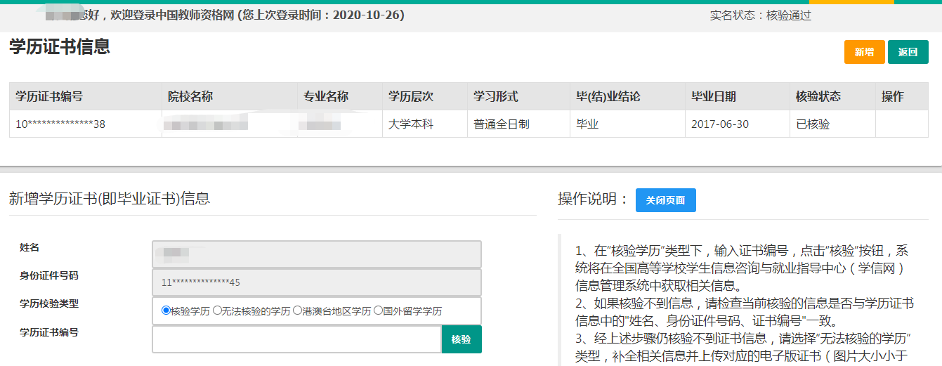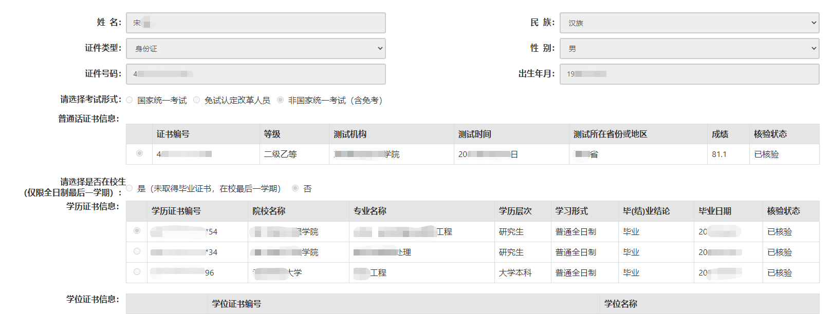 學(xué)歷證書信息:根據(jù)申請人所取得的學(xué)歷證書選擇學(xué)歷的校驗類型。