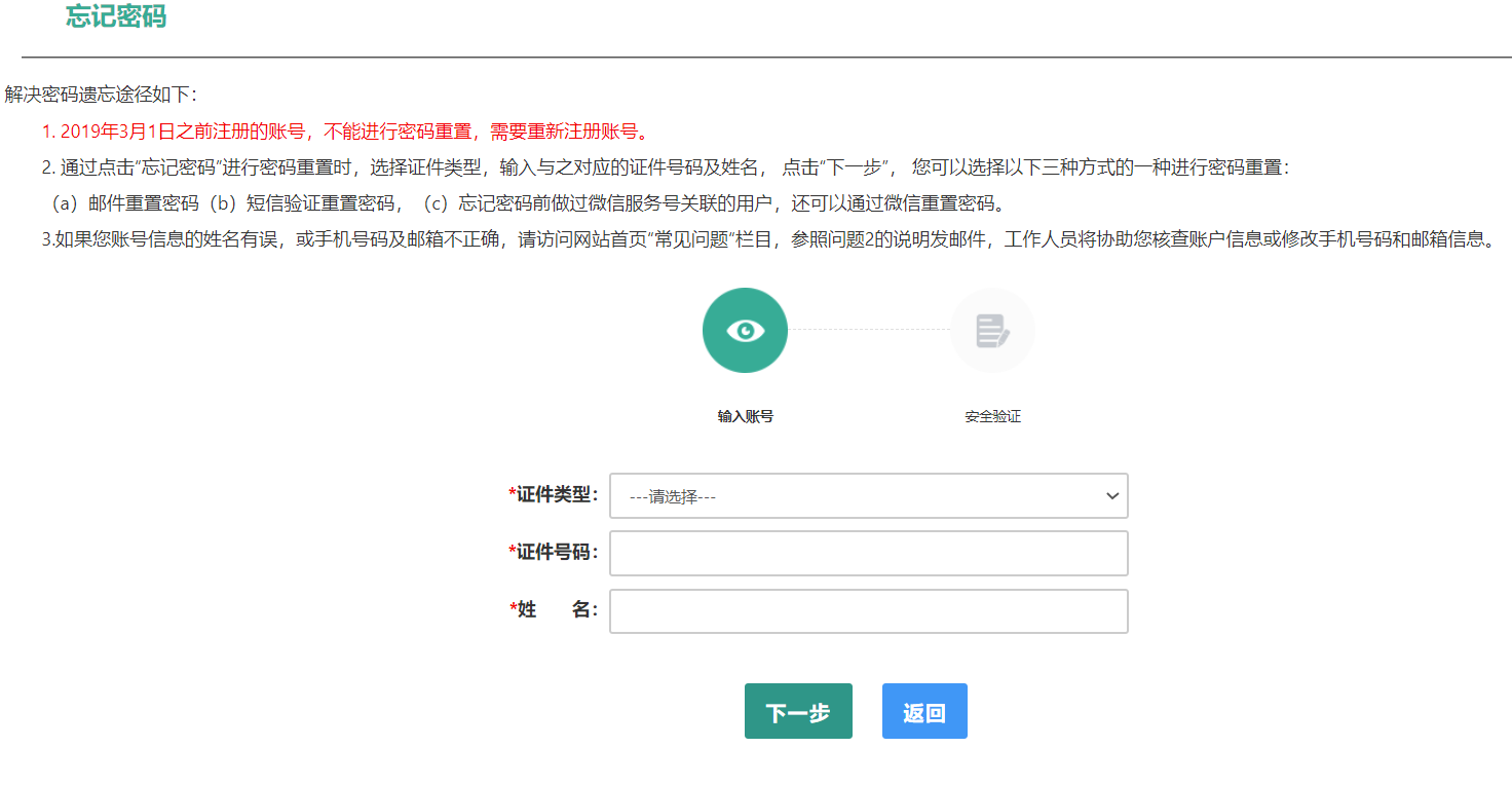選擇該賬號在系統(tǒng)中注冊時所選的證件類型,輸入對應(yīng)的證件號碼及姓名(任何一項選擇或填寫錯誤,都無法找回密碼),點擊【下一步】按鈕,共有三種密碼重置方式: