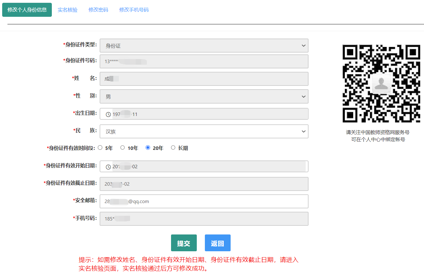 如需修改姓名,先于實名核驗功能中修改,待實名核驗通過后,個人身份信息頁面將自動更新。