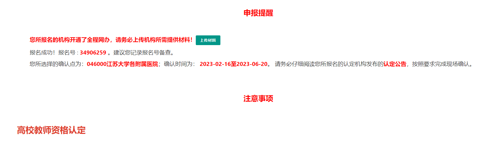 2.網(wǎng)上申報:在認(rèn)定機構(gòu)規(guī)定的網(wǎng)上報名時間內(nèi),申請人登錄“中國教師資格網(wǎng)”進(jìn)行報名,在報名前,請認(rèn)真閱讀相關(guān)須知和注意事項,如實、準(zhǔn)確填寫申報信息,并按要求上傳相應(yīng)的材料和電子證件照片(格式JPG,背景為彩色白底),完成網(wǎng)上申報的所有環(huán)節(jié),出現(xiàn)“申報提醒”頁面并生成報名號,即表示報名成功。
