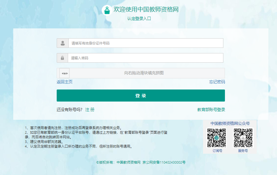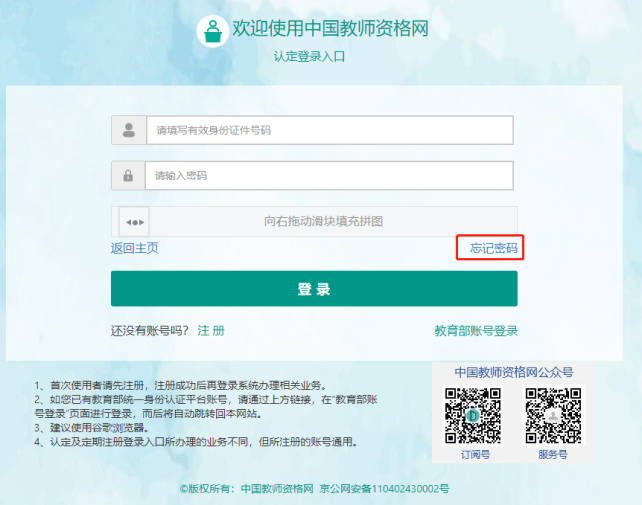 建議您通過微信掃碼關(guān)注中國教師資格網(wǎng)服務(wù)號,并與本系統(tǒng)賬號綁定,以便于忘記密碼時進(jìn)行密碼重置。