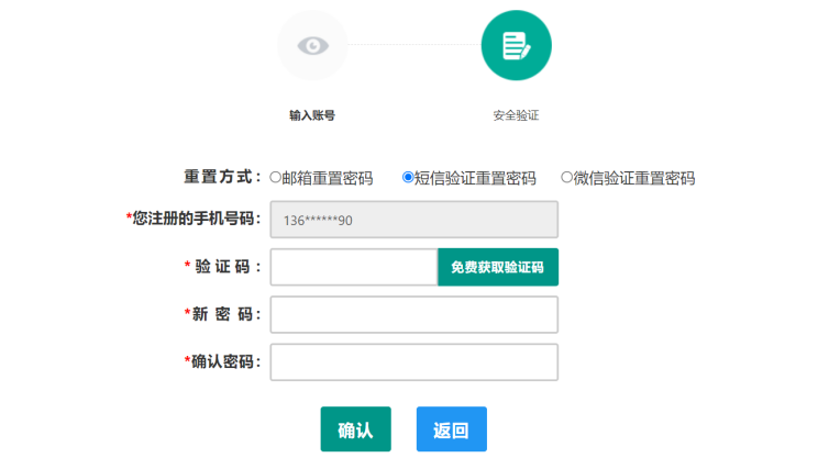短信驗證重置密碼:點擊【獲取短信驗證碼】按鈕,輸入該賬號的注冊手機所收到的短信驗證碼,填寫新密碼并再次確認(rèn)新密碼后點擊【確認(rèn)修改】按鈕。如已更換手機號或該手機號無法接收短信驗證碼,可按網(wǎng)站首頁“常見問題2”的說明發(fā)郵件申請修改手機號。