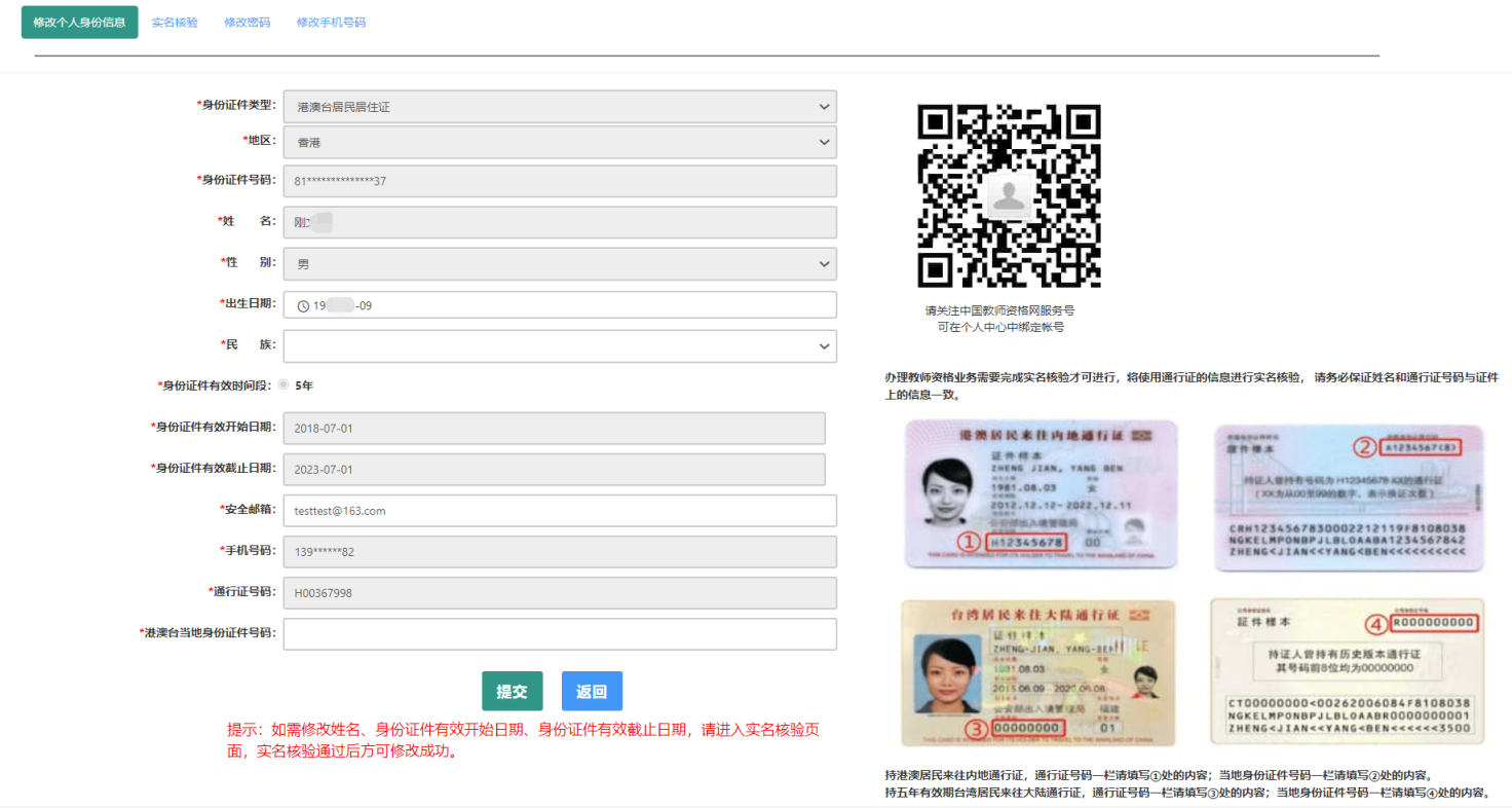 本功能用于修改個人身份信息、實名核驗、修改密碼、修改手機號碼等。