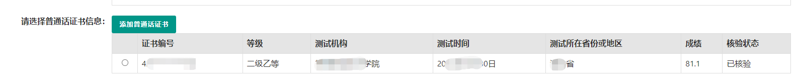 ①核驗證書:輸入證書編號,點擊【核驗】按鈕后,系統(tǒng)將在國家普通話水平測試信息管理系統(tǒng)中自動同步該證書信息。如果核驗不到信息,請檢查當(dāng)前登錄賬號的用戶信息是否與普通話證書信息中的"姓名、身份證件號碼、證書編號"一致。核驗數(shù)據(jù)來源為“全國普通話培訓(xùn)測試信息資源網(wǎng)”http://www.cltt.org/提供的2007年之后普通話數(shù)據(jù)。