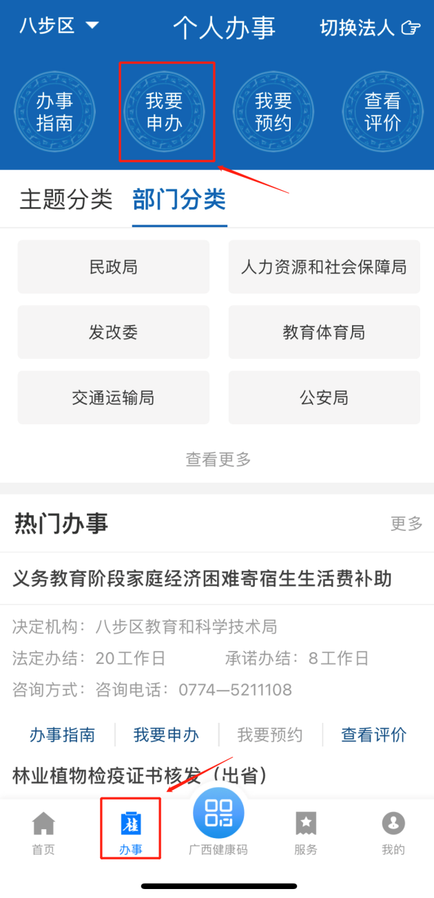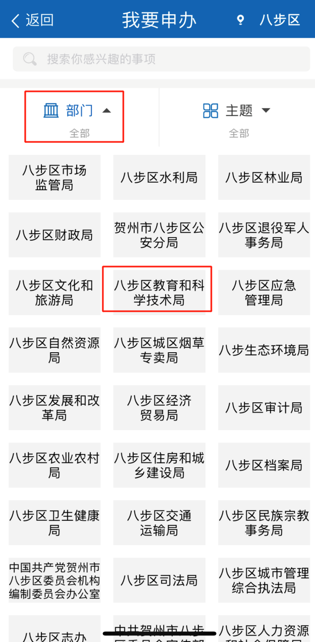 選擇下方“辦事”→“我要申辦”→“部門(mén)”→“八步區(qū)教育和科學(xué)技術(shù)局”。