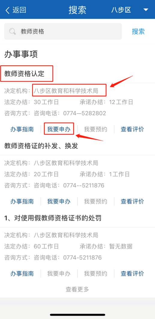 在搜索欄搜索“教師資格”,選擇法定機(jī)構(gòu)為八步區(qū)教育和科學(xué)技術(shù)局的事項(xiàng):“教師資格認(rèn)定”,點(diǎn)擊“我要申辦”,進(jìn)入辦理頁(yè)面。