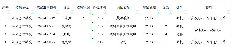 濟南藝術(shù)學校2024年公開招聘人員資格復審工作已結(jié)束。根據(jù)資格復審情況現(xiàn)就棄權(quán)、遞補情況公示如下: