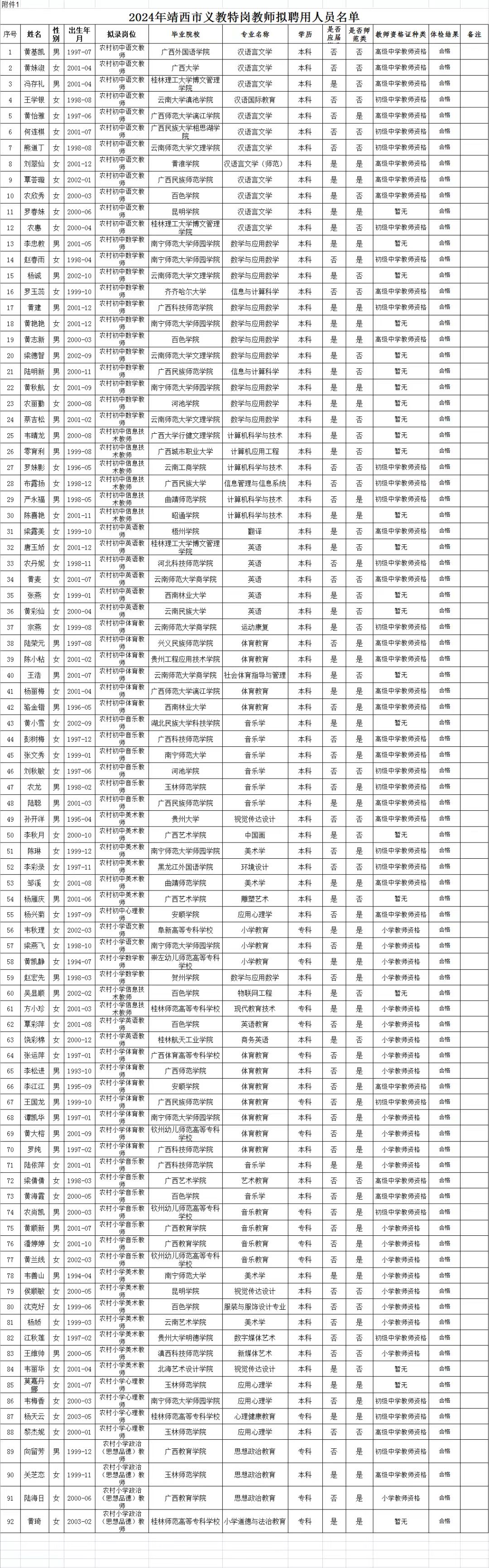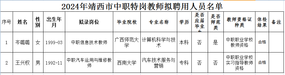 1.2024年靖西市義教特崗教師擬聘用人員名單 |