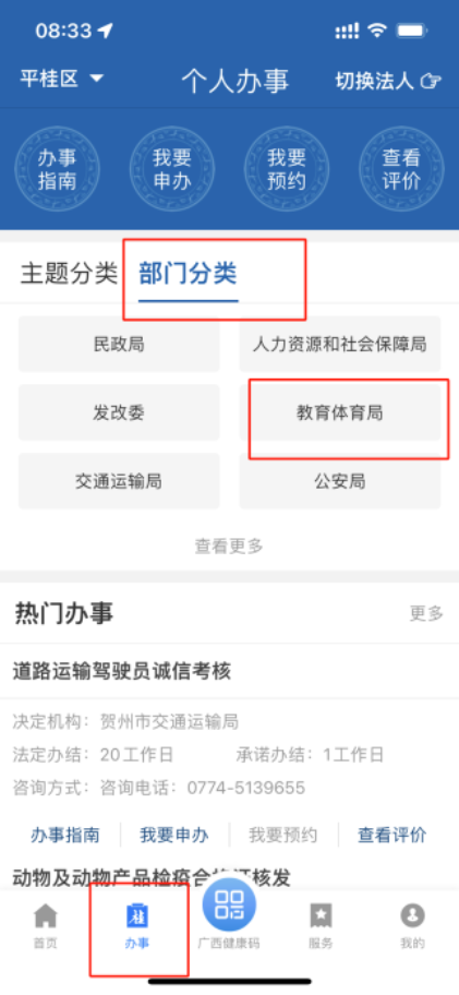 選擇下方“辦事→“部門分類→“教育體育局。
