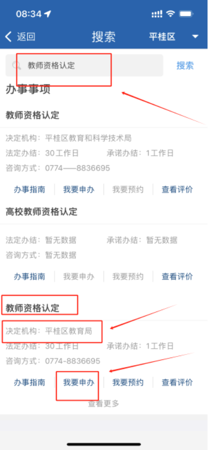 在搜索欄搜索“教師資格認定,選擇法定機構(gòu)為平桂區(qū)教育局的事項:“教師資格認定,點擊“我要申辦,進入辦理頁面。